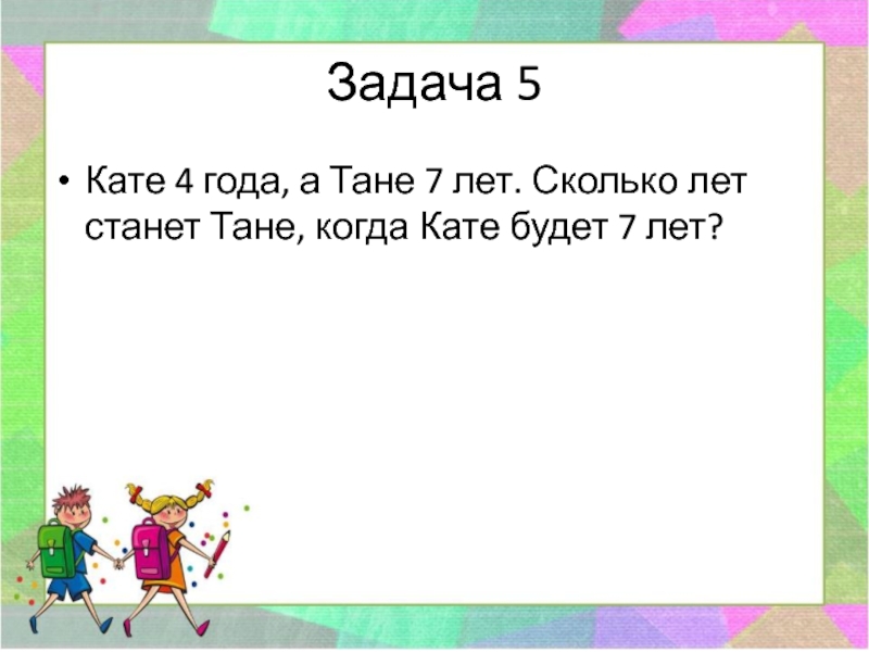Задача 5Кате 4 года, а Тане 7 лет. Сколько лет станет Тане, когда Кате будет 7 лет?