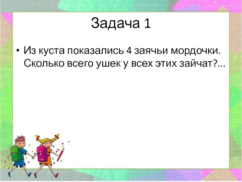Задача 1Из куста показались 4 заячьи мордочки. Сколько всего ушек у всех этих зайчат?...