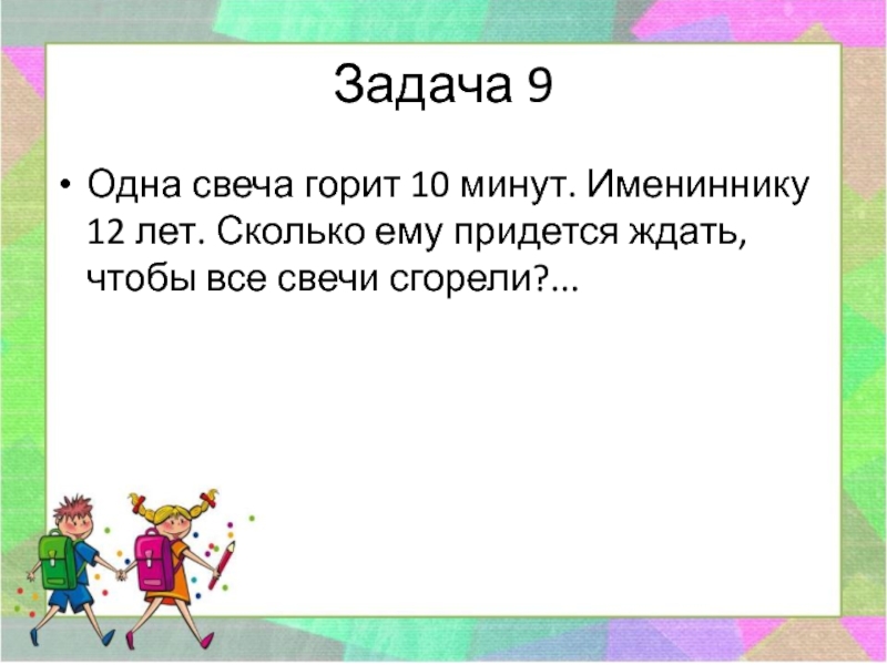 Задача 9Одна свеча горит 10 минут. Имениннику 12 лет. Сколько ему придется ждать, чтобы все свечи сгорели?...