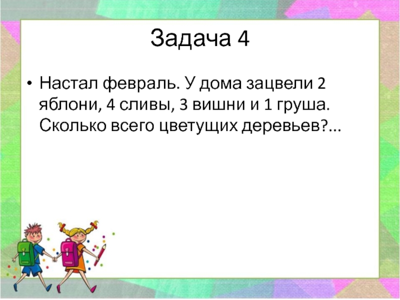 Задача 4Настал февраль. У дома зацвели 2 яблони, 4 сливы, 3 вишни и 1 груша. Сколько всего