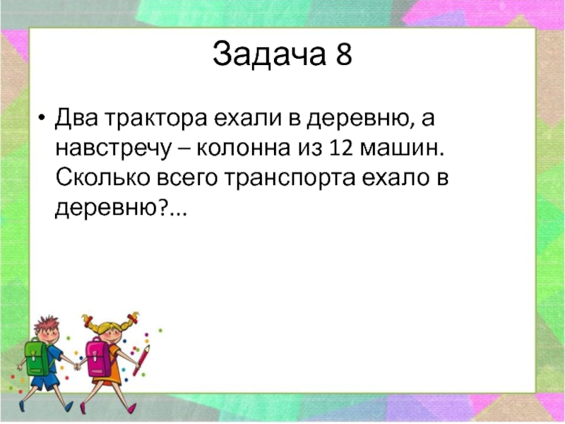 Задача 8Два трактора ехали в деревню, а навстречу – колонна из 12 машин. Сколько всего транспорта ехало