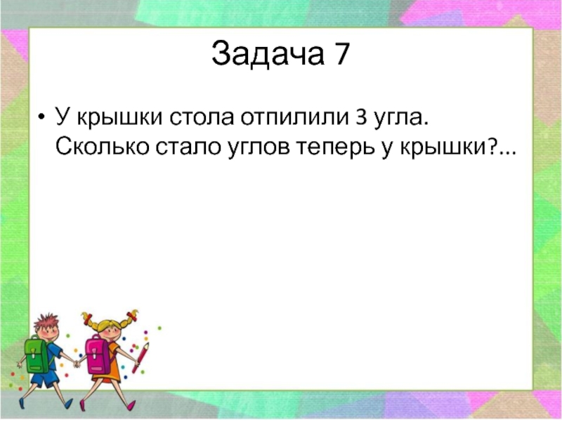 Задача 7У крышки стола отпилили 3 угла. Сколько стало углов теперь у крышки?...