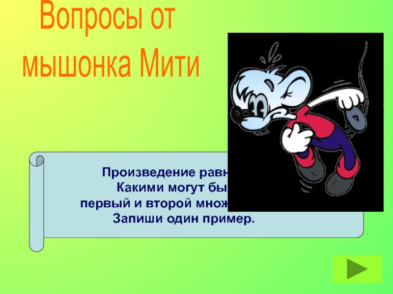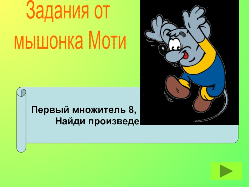 Первый множитель 8, второй 4.     Найди произведение.Задания от мышонка Моти