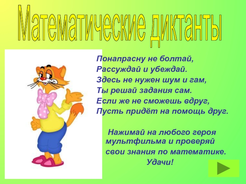 Понапрасну не болтай,Рассуждай и убеждай.Здесь не нужен шум и гам,Ты решай задания сам.Если же не сможешь вдруг,Пусть придёт на помощь друг. Нажимай на любого героя мультфильма и проверяй свои знания по