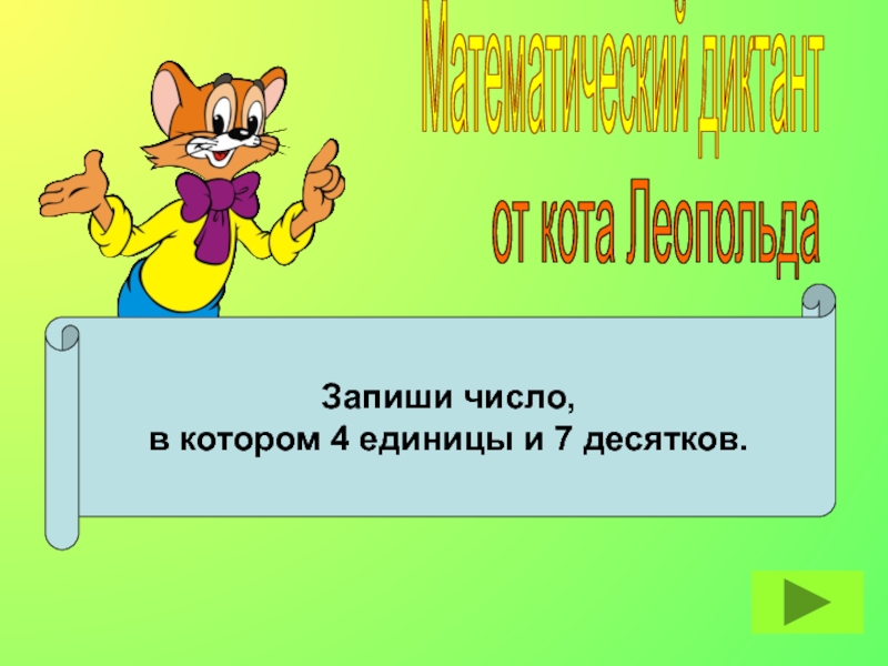 Запиши число, в котором 4 единицы и 7 десятков.Математический диктантот кота Леопольда