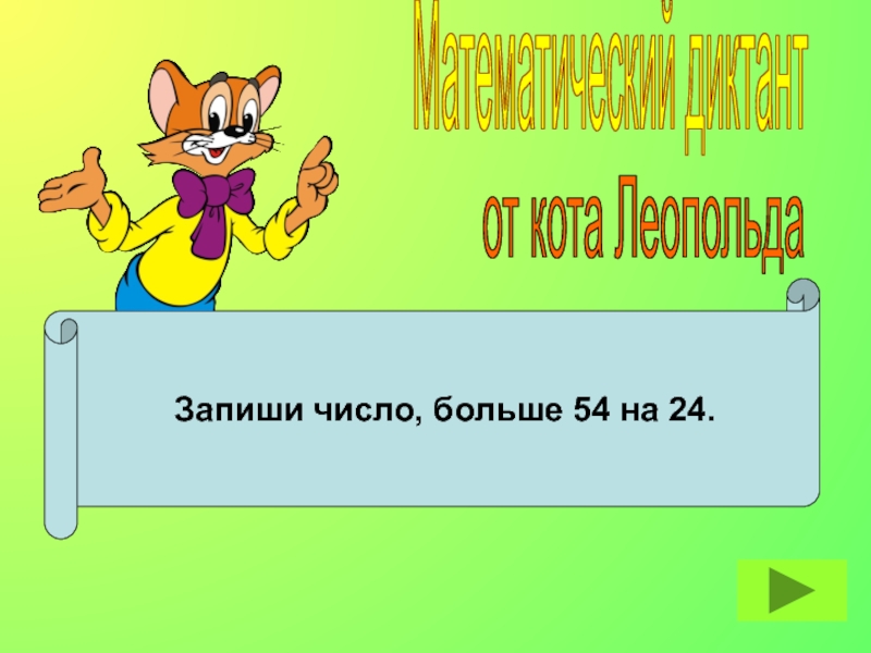 Запиши число, больше 54 на 24.Математический диктантот кота Леопольда