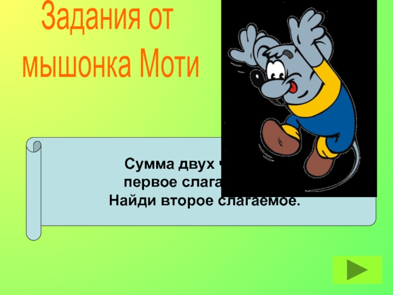 Сумма двух чисел 63, первое слагаемое 40.Найди второе слагаемое.Задания от мышонка Моти