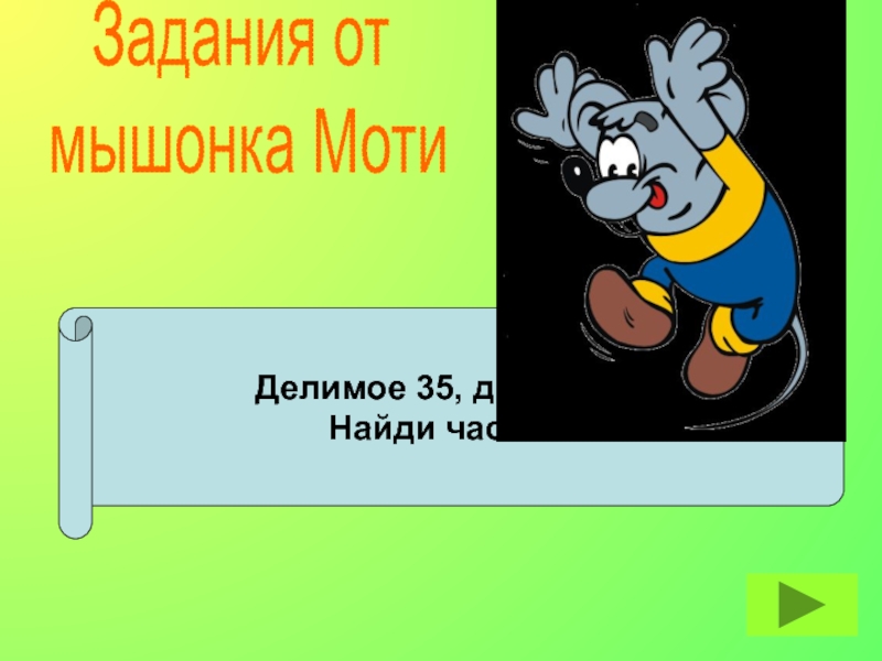Делимое 35, делитель 5.Найди частное.Задания от мышонка Моти