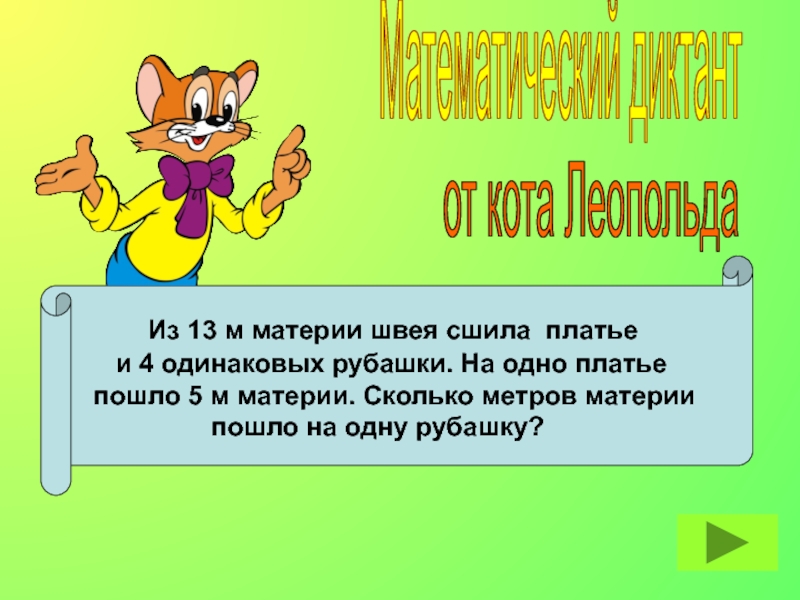 Из 13 м материи швея сшила платье   и 4 одинаковых рубашки.