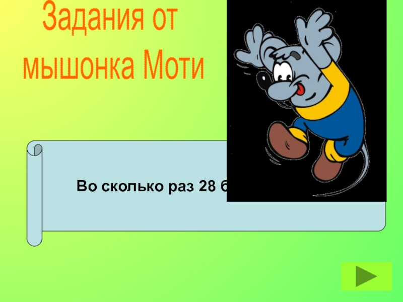 Во сколько раз 28 больше 4?Задания от мышонка Моти