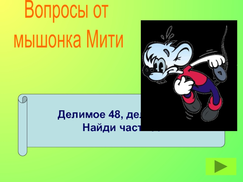 Делимое 48, делитель 6. Найди частное.Вопросы от мышонка Мити