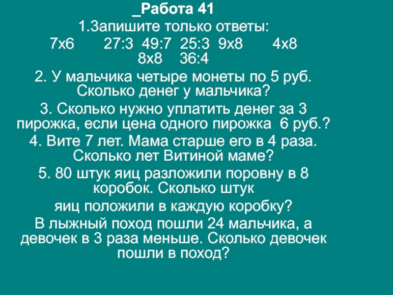5. 80 штук яиц разложили поровну в 8 коробок. Сколько штук