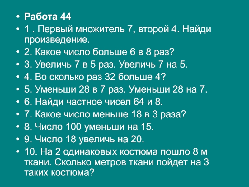 1 . Первый множитель 7, второй 4. Найди произведение.