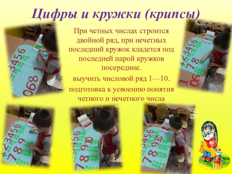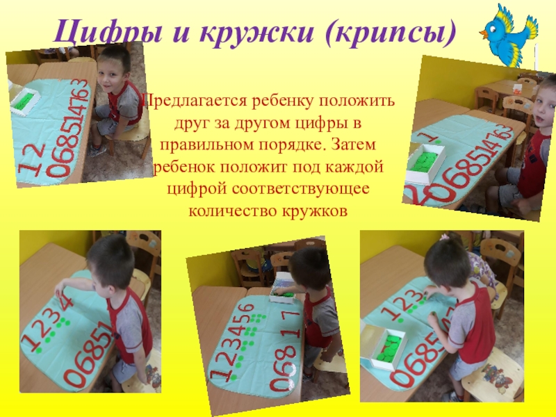 Цифры и кружки (крипсы)Предлагается ребенку положить друг за другом цифры в правильном порядке. Затем ребенок положит под