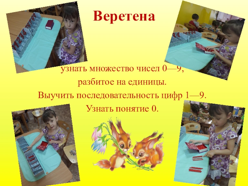 Веретена узнать множество чисел 0—9, разбитое на единицы. Выучить последовательность цифр 1—9. Узнать понятие 0.
