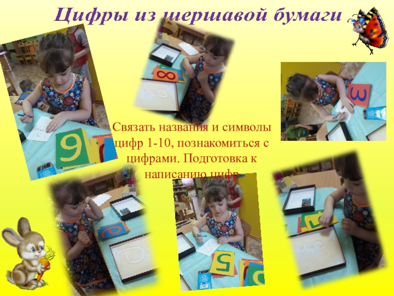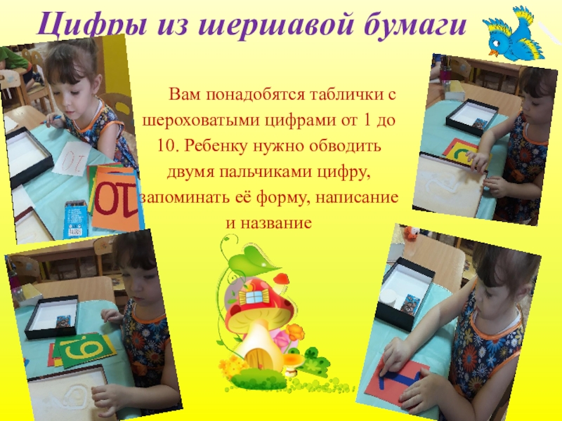 Цифры из шершавой бумагиВам понадобятся таблички с шероховатыми цифрами от 1 до 10. Ребенку нужно обводить двумя пальчиками цифру, запоминать её форму, написание и название