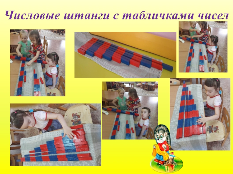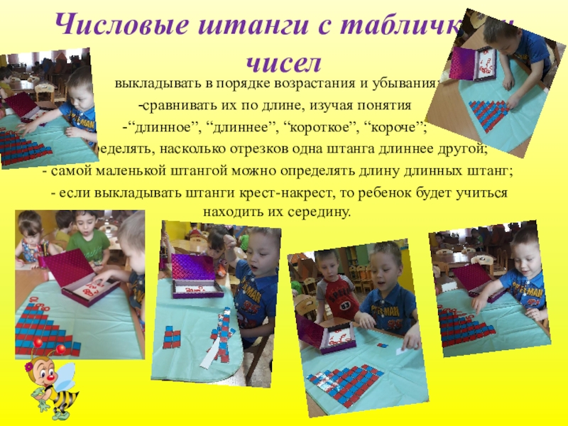Числовые штанги с табличками чиселвыкладывать в порядке возрастания и убывания; сравнивать их по длине, изучая понятия “длинное”,