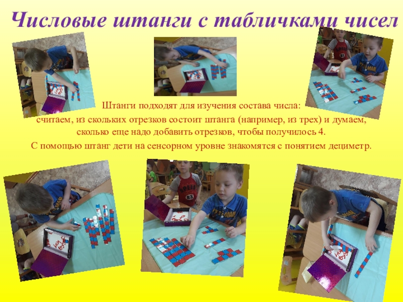 С помощью штанг дети на сенсорном уровне знакомятся с понятием дециметр.