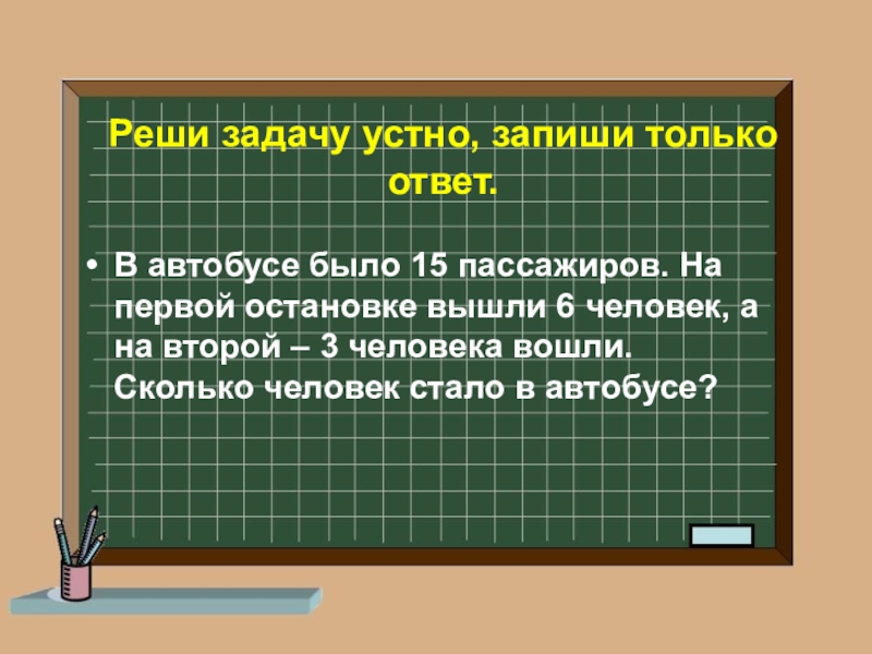 Реши задачу устно, запиши только ответ.В автобусе было 15 пассажиров. На первой остановке вышли 6 человек, а