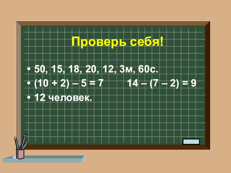 Проверь себя!50, 15, 18, 20, 12, 3м, 60с.(10 + 2) – 5 = 7