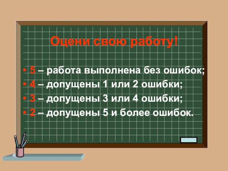Оцени свою работу!5 – работа выполнена без ошибок;4 – допущены 1 или 2 ошибки;3 – допущены 3