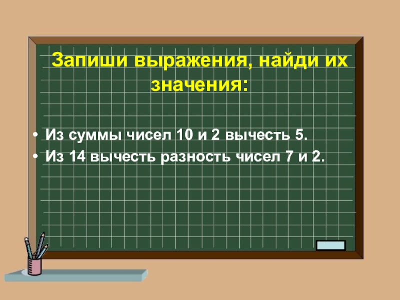 Запиши выражения, найди их значения:Из суммы чисел 10 и 2 вычесть 5.Из 14 вычесть разность чисел 7