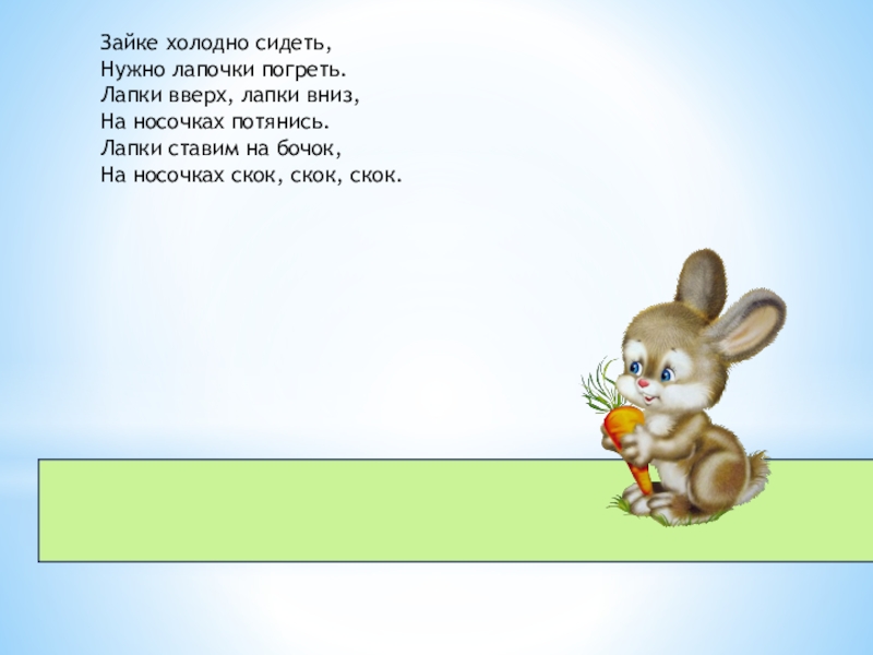 Зайке холодно сидеть,Нужно лапочки погреть.Лапки вверх, лапки вниз,На носочках потянись.Лапки ставим на бочок,На носочках скок, скок, скок.