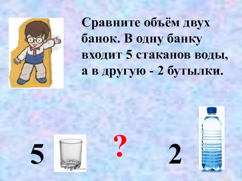 Сравните объём двух банок. В одну банку входит 5 стаканов воды, а в другую - 2 бутылки.