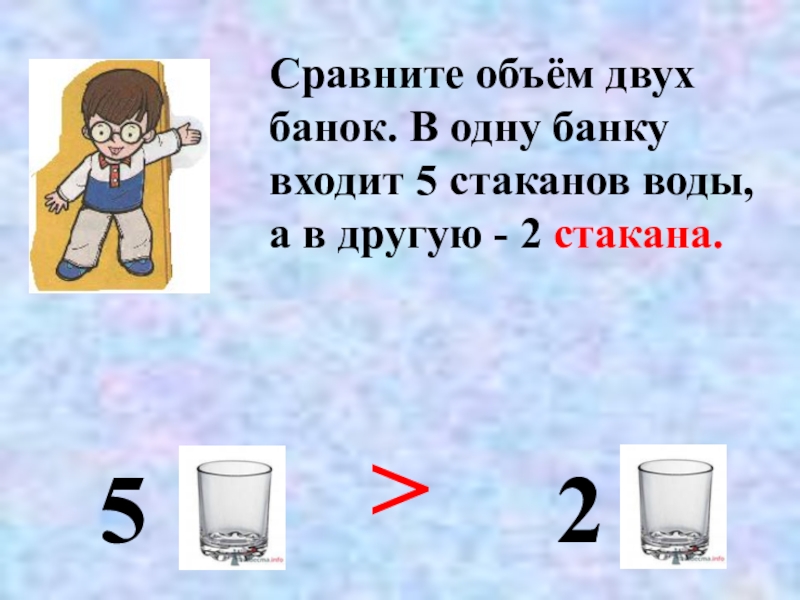 Сравните объём двух банок. В одну банку входит 5 стаканов воды, а в другую - 2 стакана.