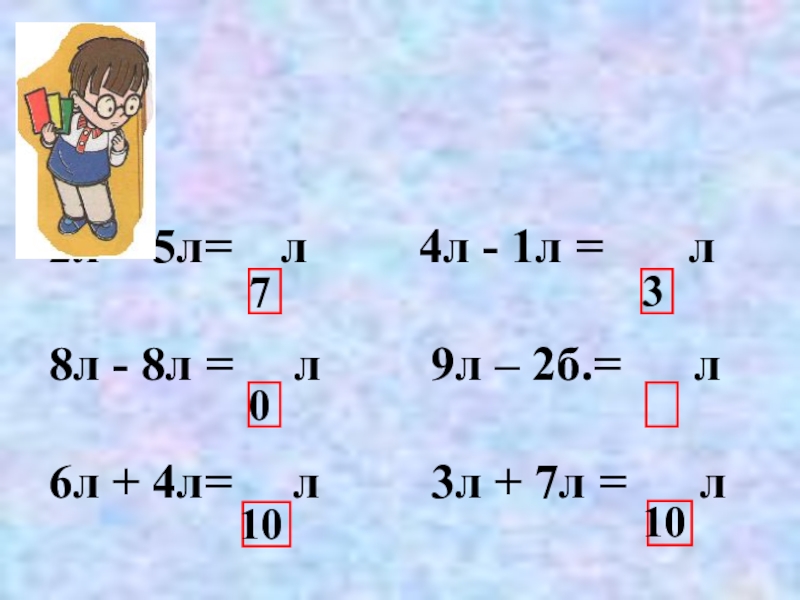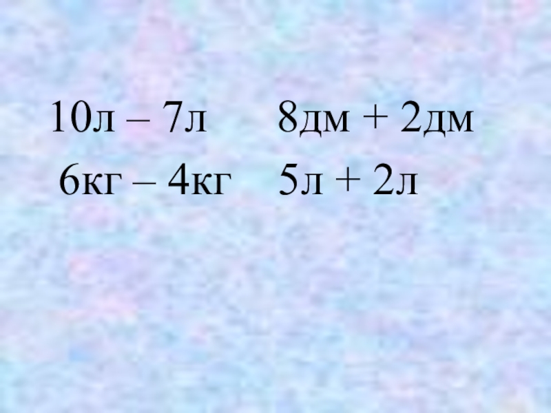 10л – 7л   8дм + 2дм 6кг – 4кг  5л + 2л