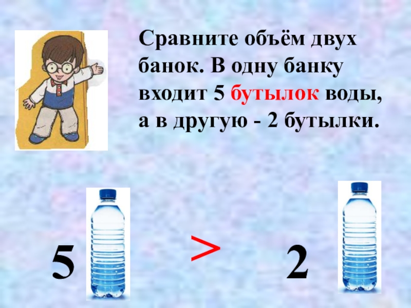 Слайд 9Сравните объём двух банок. В одну банку входит 5 бутылок воды,