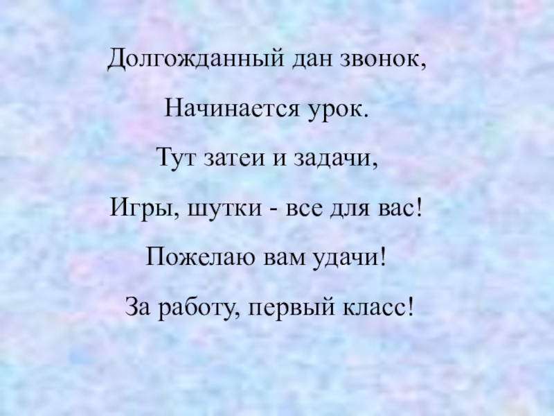Долгожданный дан звонок, Начинается урок. Тут затеи и задачи, Игры, шутки - все для вас! Пожелаю вам удачи!