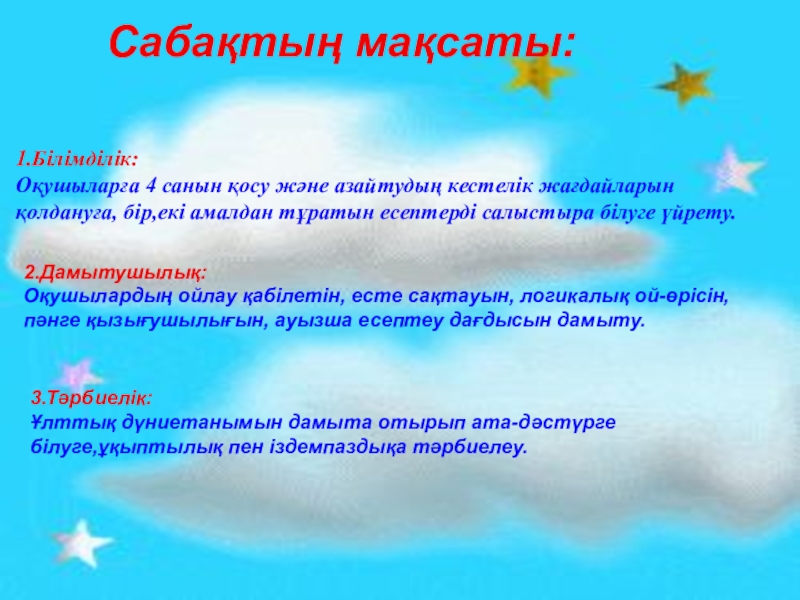 пәнге қызығушылығын, ауызша есептеу дағдысын дамыту.