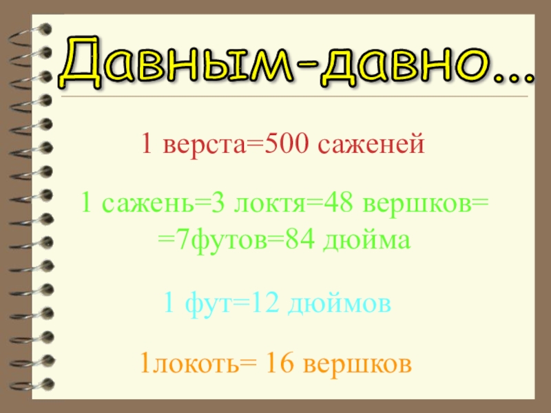 Давным-давно... 1 верста=500 саженей1 сажень=3 локтя=48 вершков==7футов=84 дюйма1 фут=12 дюймов1локоть= 16 вершков