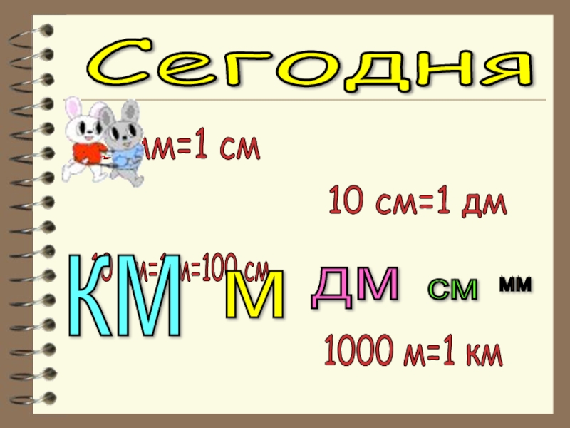 Сегодня 10 мм=1 см 10 см=1 дм 10 дм=1 м=100 см 1000 м=1 км км м дм