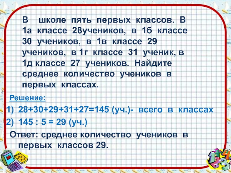 В школе пять первых классов. В 1а классе 28учеников, в 1б классе 30 учеников, в 1в классе 29 учеников, в 1г классе 31 ученик, в 1д классе 27 учеников. Найдите среднее количество учеников в первых классах.