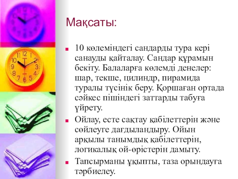 Мақсаты:10 көлеміндегі сандарды тура кері санауды қайталау. Сандар құрамын бекіту. Балаларға көлемді денелер: шар, текше, цилиндр, пирамида