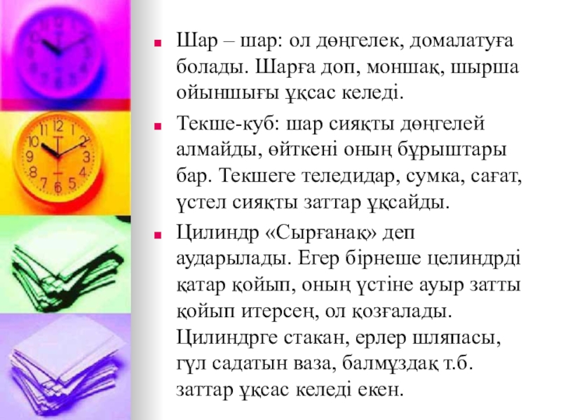Шар – шар: ол дөңгелек, домалатуға болады. Шарға доп, моншақ, шырша ойыншығы ұқсас келеді.Текше-куб: шар сияқты дөңгелей