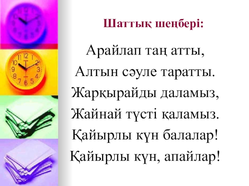 Шаттық шеңбері:Арайлап таң атты,Алтын сәуле таратты.Жарқырайды даламыз,Жайнай түсті қаламыз.Қайырлы күн балалар!Қайырлы күн, апайлар!