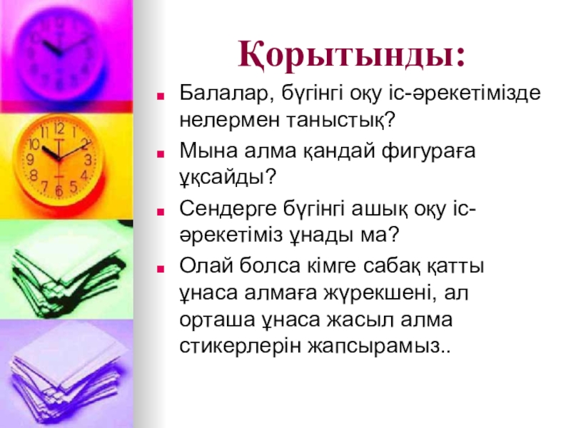 Қорытынды:Балалар, бүгінгі оқу іс-әрекетімізде нелермен таныстық?Мына алма қандай фигураға ұқсайды?Сендерге бүгінгі ашық оқу іс-әрекетіміз ұнады ма?Олай болса