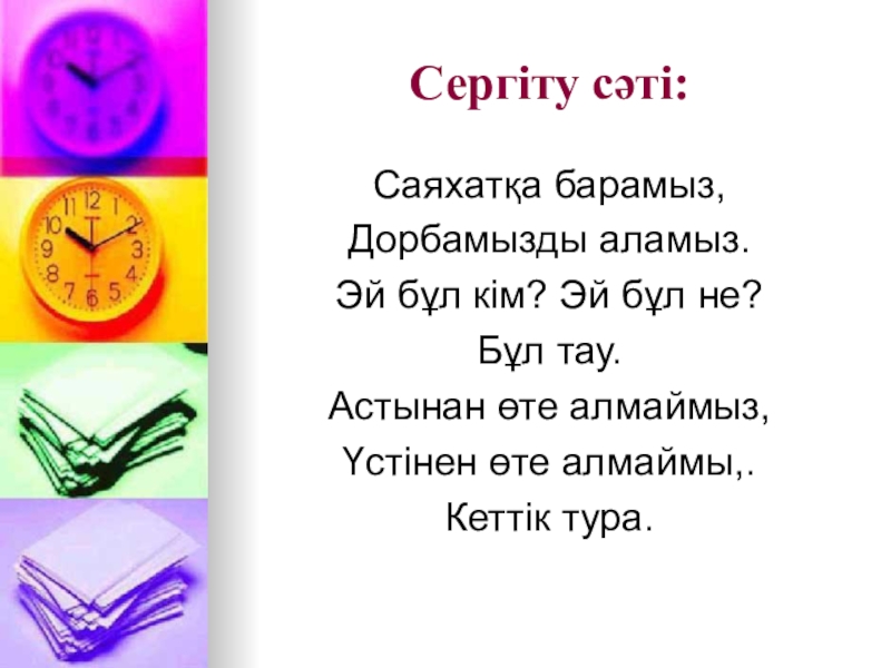 Сергіту сәті:Саяхатқа барамыз,Дорбамызды аламыз.Эй бұл кім? Эй бұл не?Бұл тау.Астынан өте алмаймыз,Үстінен өте алмаймы,.Кеттік тура.