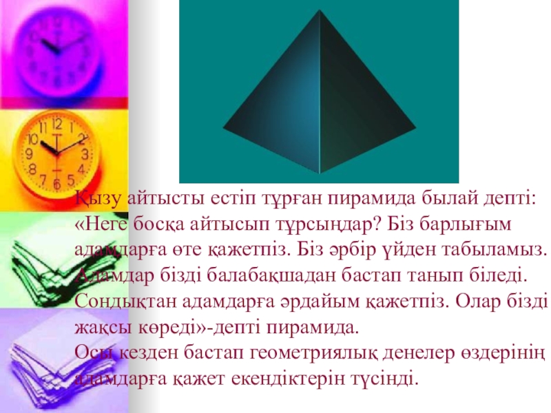 Біз барлығым адамдарға өте қажетпіз. Біз әрбір үйден табыламыз. Адамдар бізді балабақшадан бастап танып біледі. Сондықтан адамдарға әрдайым қажетпіз. Олар бізді жақсы көреді»-депті пирамида. Осы кезден бастап геометриялық денелер өздерінің адамдарға қажет екендіктерін түсінді.