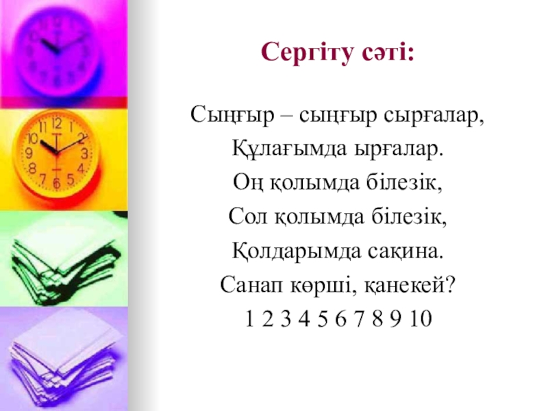 Сергіту сәті:Сыңғыр – сыңғыр сырғалар,Құлағымда ырғалар.Оң қолымда білезік,Сол қолымда білезік,Қолдарымда сақина.Санап көрші, қанекей?1 2 3 4 5