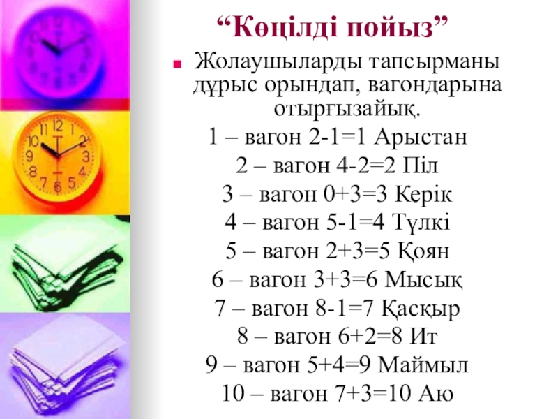 “Көңілді пойыз”Жолаушыларды тапсырманы дұрыс орындап, вагондарына отырғызайық.1 – вагон 2-1=1 Арыстан2 – вагон 4-2=2 Піл3 – вагон