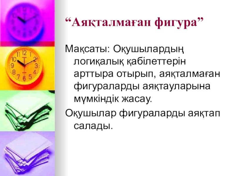 “Аяқталмаған фигура” Мақсаты: Оқушылардың логиқалық қабілеттерін арттыра отырып, аяқталмаған фигураларды аяқтауларына мүмкіндік жасау.Оқушылар фигураларды аяқтап салады.