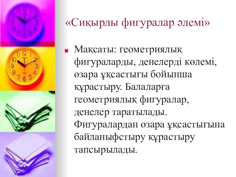 «Сиқырлы фигуралар әлемі» Мақсаты: геометриялық фигураларды, денелерді көлемі, өзара ұқсастығы бойынша құрастыру. Балаларға геометриялық фигуралар, денелер таратылады.