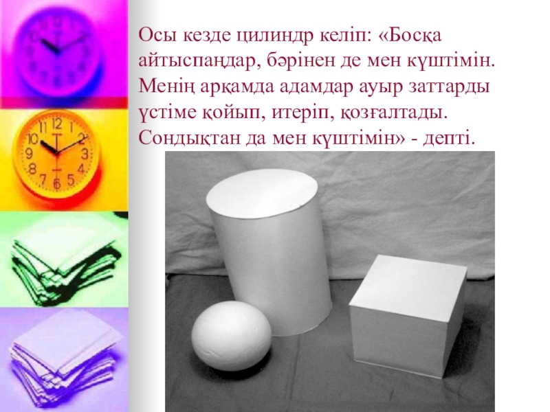 Слайд 9Осы кезде цилиндр келіп: «Босқа айтыспаңдар, бәрінен де мен күштімін. Менің