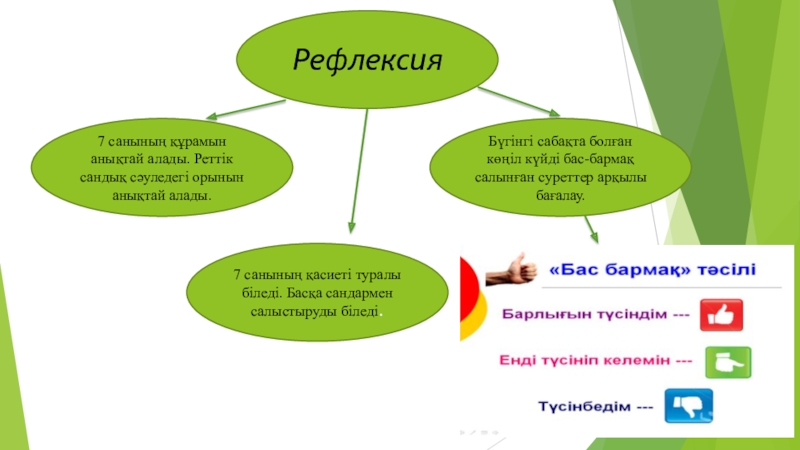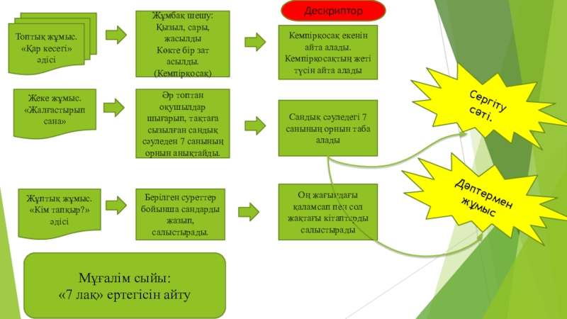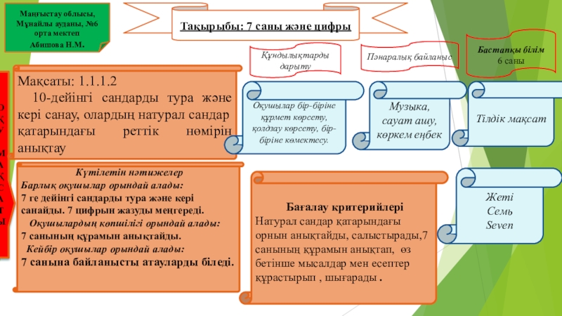 Натурал сандар қатарындағы орнын анықтайды, салыстырады,7 санының құрамын анықтап, өз бетінше мысалдар мен есептер құрастырып , шығарады .