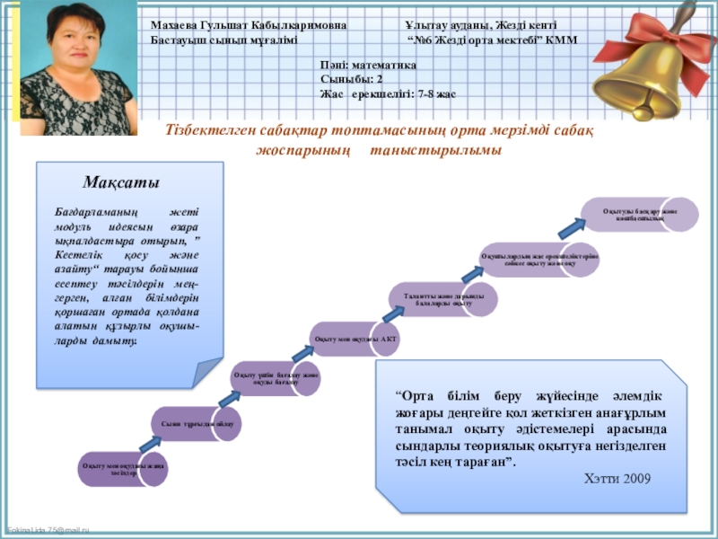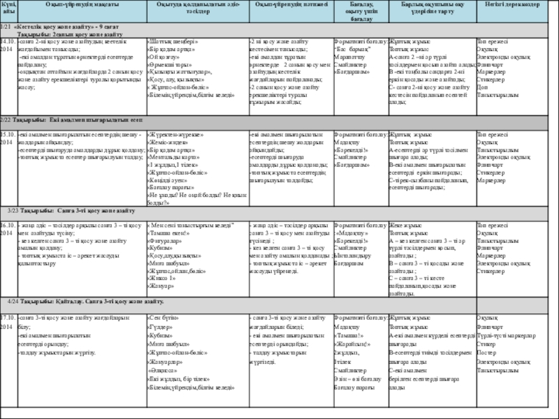 Бағдарламаның жеті модуль идеясын өзара ықпалдастыра отырып, ”Кестелік қосу және азайту“ тарауы бойынша есептеу тәсілдерін мең-герген, алған білімдерін қоршаған ортада қолдана алатын құзырлы оқушы-ларды дамыту.