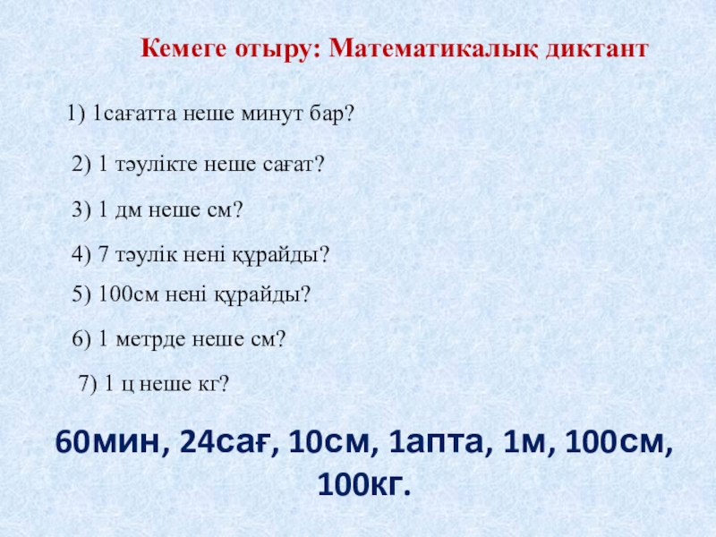 60мин, 24сағ, 10см, 1апта, 1м, 100см, 100кг.